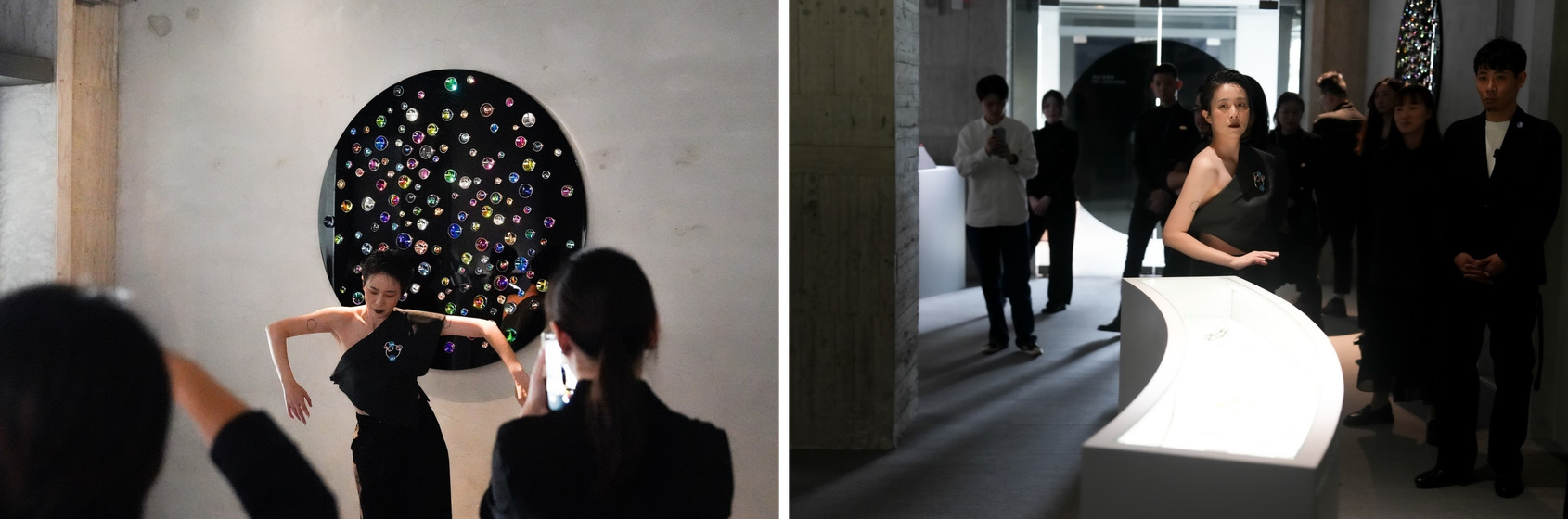 「本次服裝創作的靈感,緊密連結於作品背後的文學典故、奇幻想像與時間流逝的意象。APUJAN延伸出奇幻的宇宙世界,巧妙融合時裝、藝術、珠寶與人體的跨界元素,更從藝術家螢光藍橘的作品中汲取靈感,打造出獨具特色的「天穹之眼」服裝造型。」