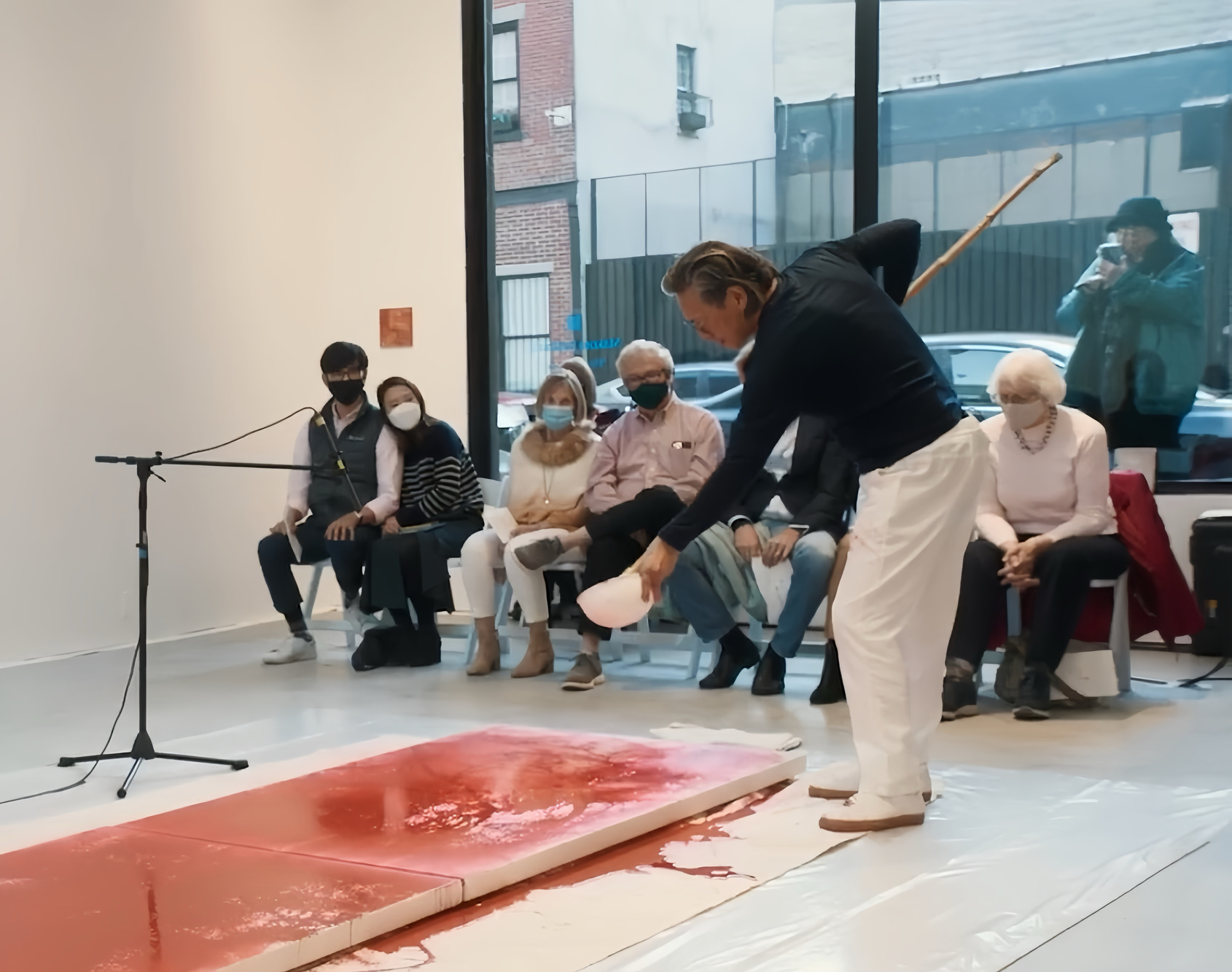 Makoto Fujimura unfolded a profound spatial depth through a palette of dark hues, upon which he splashed washes of green reminiscent of spring water and faint traces of sky-blue. Over these he layered dynamic structures of gold leaf, which flow in resonance. It is as though light, having passed beyond trauma and shadow, now stains the fractured curtain, heralding the arrival of hope.
