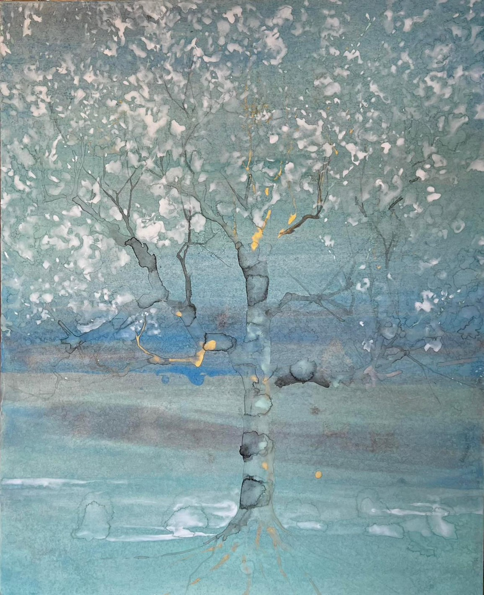 The main structure of the painting — the tree’s branches — is rendered with the economy of ink lines, while blossoms and traces of rings are layered through mineral pigments, shell-white, and gold and silver leaf, forming luminous circular marks that evoke both the passage of years and the vestiges of light. The space itself rejects linear perspective, unfolding instead as a “breathing space” made of translucent mineral hues, where shifting light catches the metallic fragments, creating a depth that seems to flow.